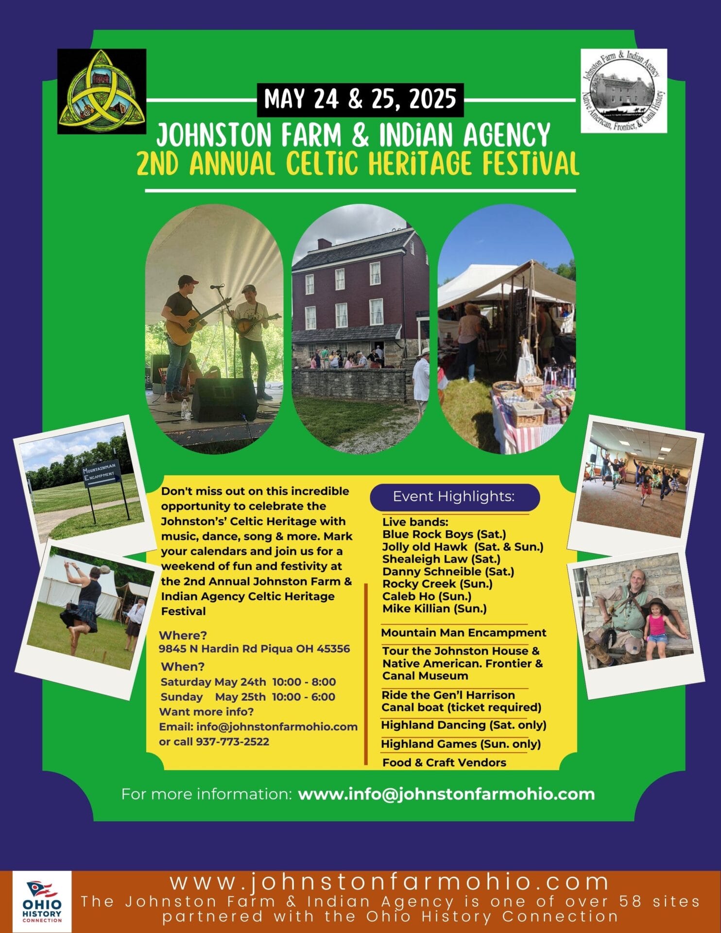 May 24 2025 Johnston Farm & Indian Agency Celtic Heritage Festival May 24, 2025 @ 10:00 AM - May 25, 2025 @ 6:00 PM EDT Johnston Farm and Indian Agency 9845 N. Hardin Road, Piqua Event Details Get Directions